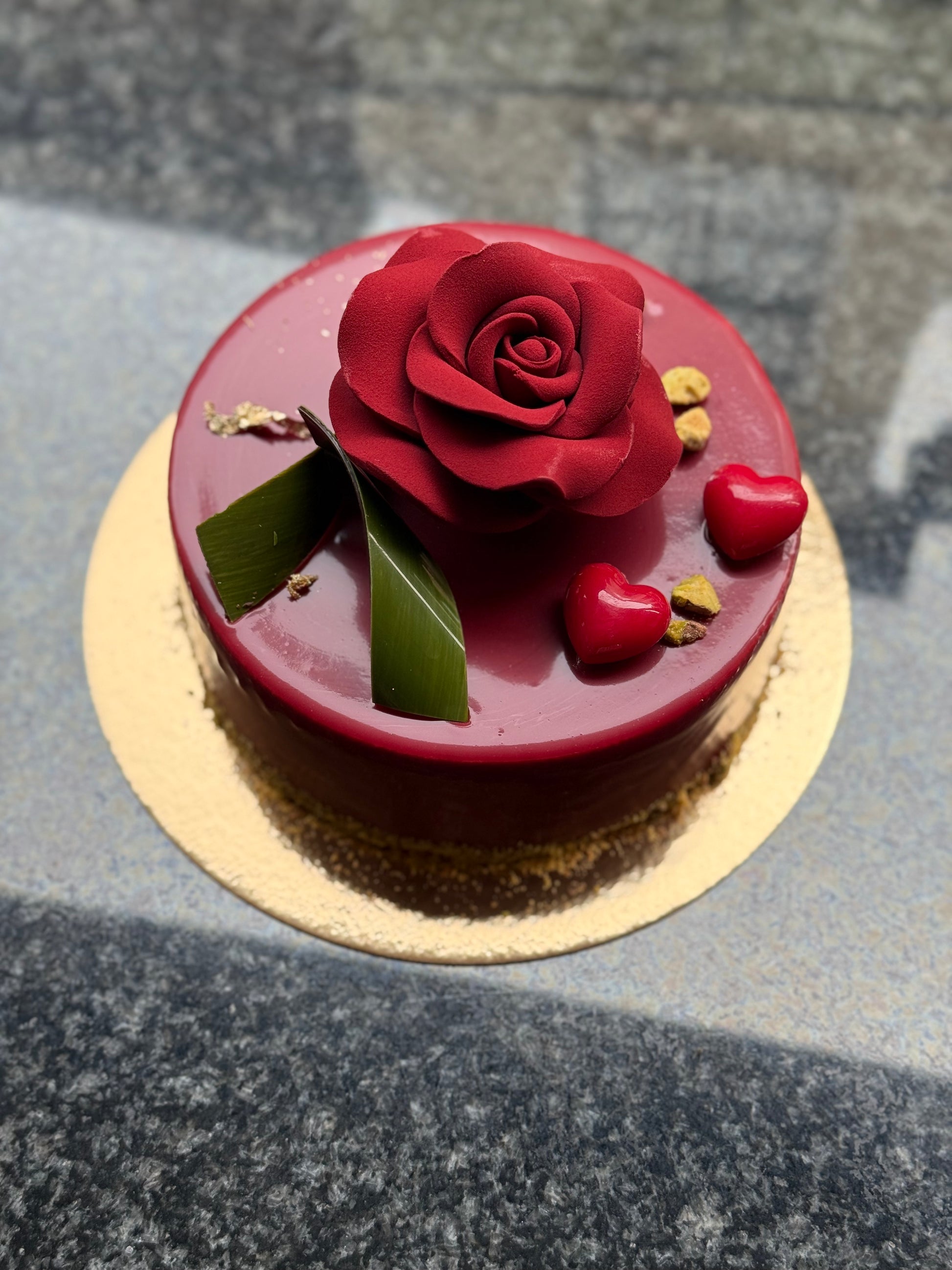 Laat je verleiden door de verfijnde smaken van onze J'taime Dubai taart. Deze onweerstaanbare creatie combineert romige melkchocolademousse met een knapperige pistache krokantvulling, gemaakt met authentieke kadayif. Gevuld met een zachte chocoladecakebodem zorgt deze taart voor een perfecte balans tussen zoet, romig en knapperig.