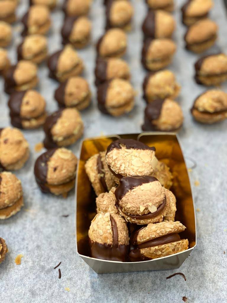 Amandelproges schuim gevuld met een Ganache van melk chocolade. Verpakt per 7a 8 stuks(175gr)